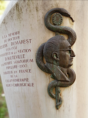 Elle porte l'inscription "À la mémoire du Docteur Frédéric Dumarest 1870-1951), fondateur de la station d'Hauteville et du premier sanatorium populaire - 1900 -
